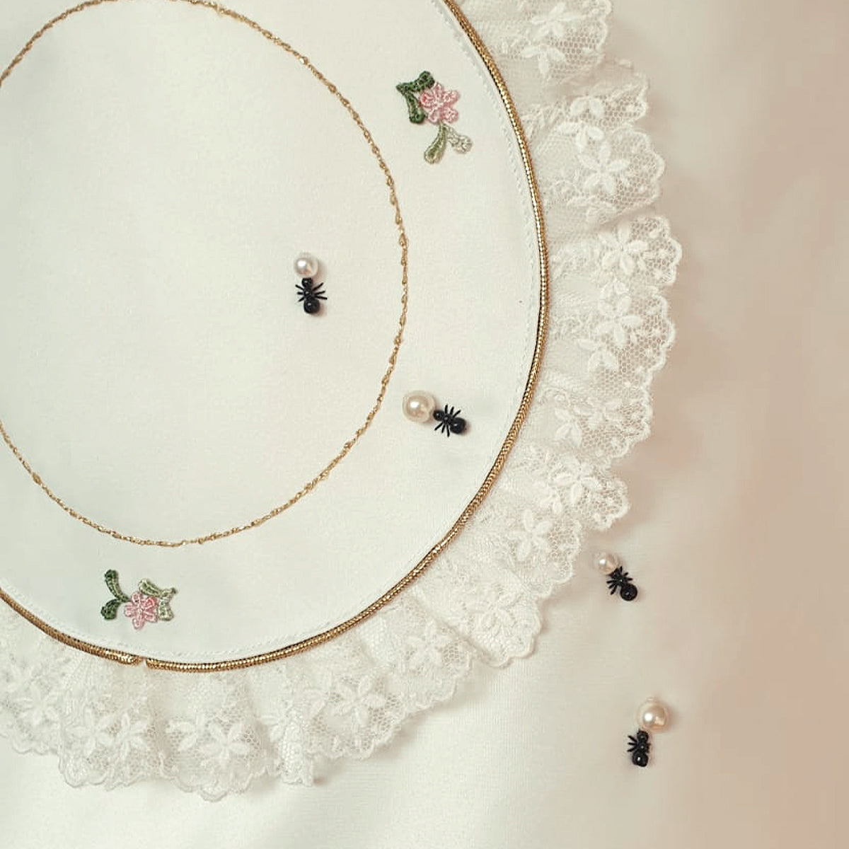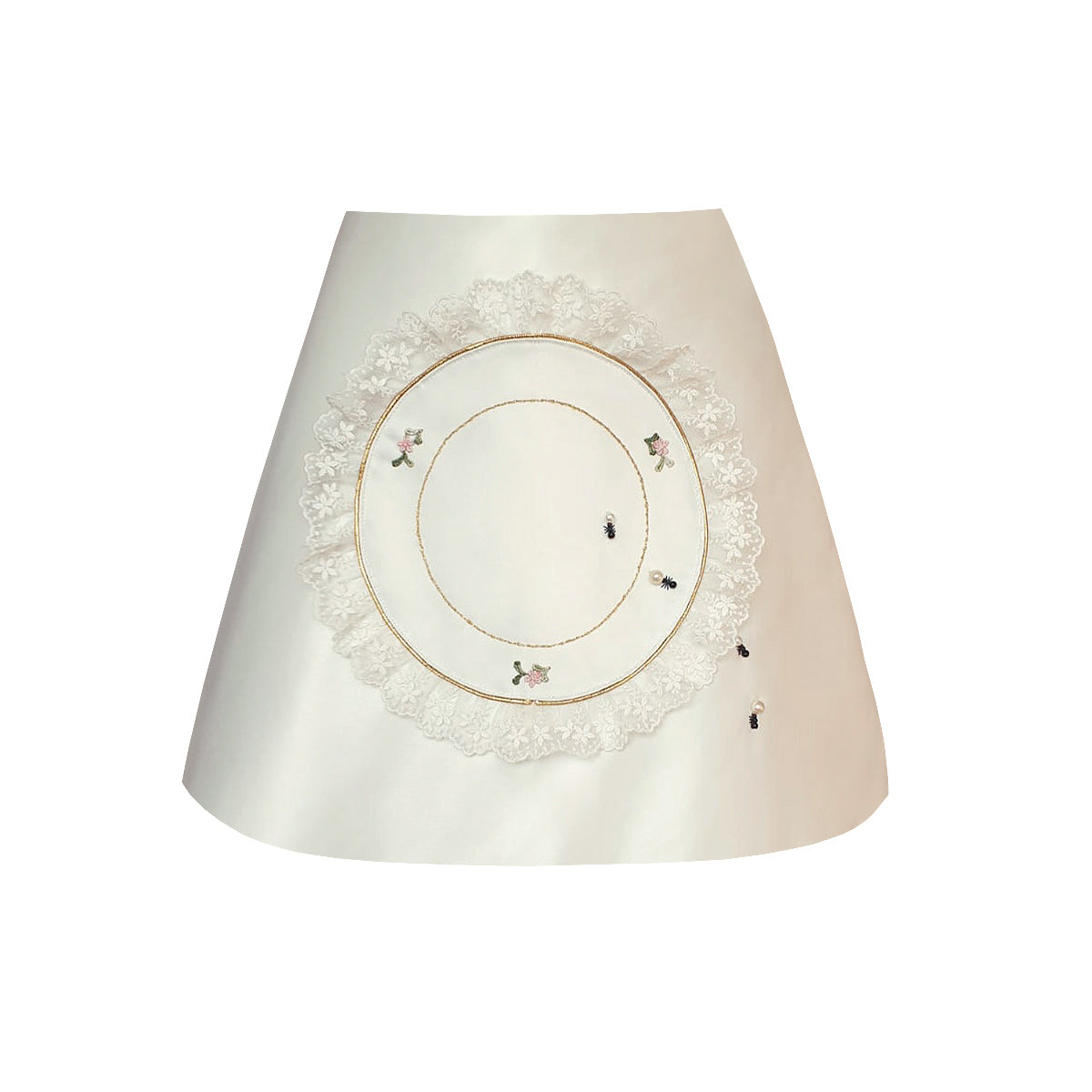 Made to Order bias cut white satin mini skirt. Vintage lace and hand stiched flowers detail. Beaded ant embroidery. Fully lined. Designed and handmade by me in my small studio in Lima, Peru. Hand washing is recommended, wash inside out. Hang to dry. If needed, tumble dry low.